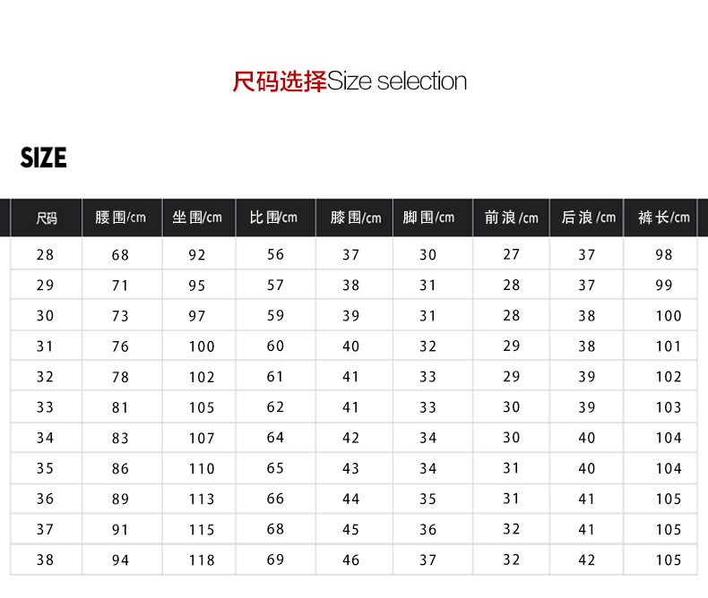 - 尺码:28 29 30 31 32 33 34 36 38
