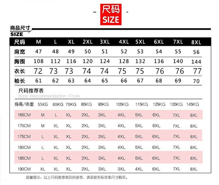 - 尺码:XL 140斤左右可穿 2XL 160斤左右可穿 3XL 180斤左右可穿 4XL 200斤左右可穿 5XL 225斤左右可穿 6XL 240斤左右可穿 7XL 265斤左右可穿 8XL 285斤左右可穿