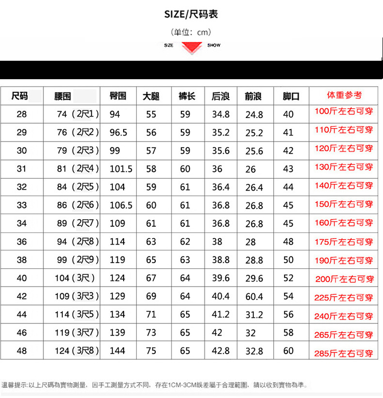- 尺码:32码(腰2尺5)140斤左右可穿 33码(腰2尺6)150斤左右可穿 34码(腰2尺7)160斤左右可穿 36码(腰2尺8)175斤左右可穿 38码(腰2尺9)190斤左右可穿 40码(腰3尺) 200斤左右可穿 42码(腰3尺3)225斤左右可穿 44码(腰3尺5)240斤左右可穿 46码(腰3尺7)265斤左右可穿 48码(腰3尺8)285斤左右可穿