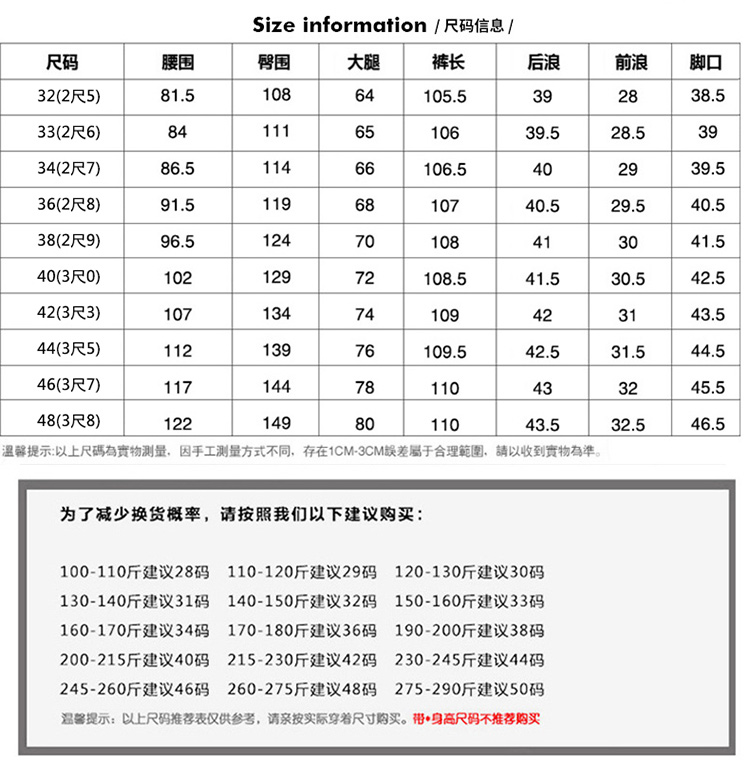 - 尺码:32码(腰2尺5)140斤左右可穿 33码(腰2尺6)150斤左右可穿 34码(腰2尺7)160斤左右可穿 36码(腰2尺8)175斤左右可穿 38码(腰2尺9)190斤左右可穿 40码(腰3尺) 200斤左右可穿 42码(腰3尺3)225斤左右可穿 44码(腰3尺5)240斤左右可穿240斤 46码(腰3尺7)265斤左右可穿