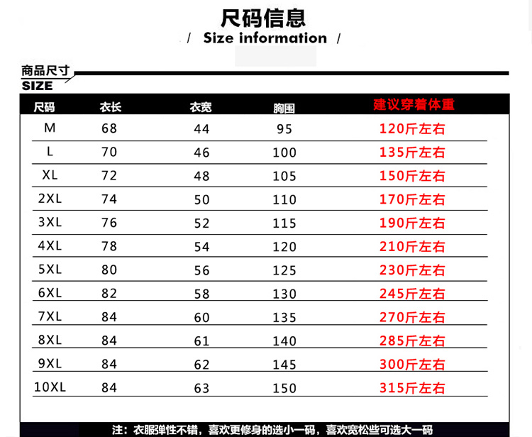 - 尺码:M 100斤左右可穿 L 120斤左右可穿 XL 140斤左右可穿 2XL 160斤左右可穿 3XL 180斤左右可穿 4XL 200斤左右可穿 5XL 225斤左右可穿 6XL 240斤左右可穿 7XL 265斤左右可穿 8XL 285斤左右可穿 9XL 300斤左右可穿 10XL 315斤左右可穿
