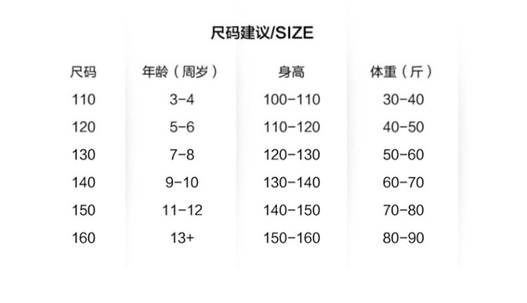 尺码:110cm 120cm 130cm 140cm 150cm 160cm