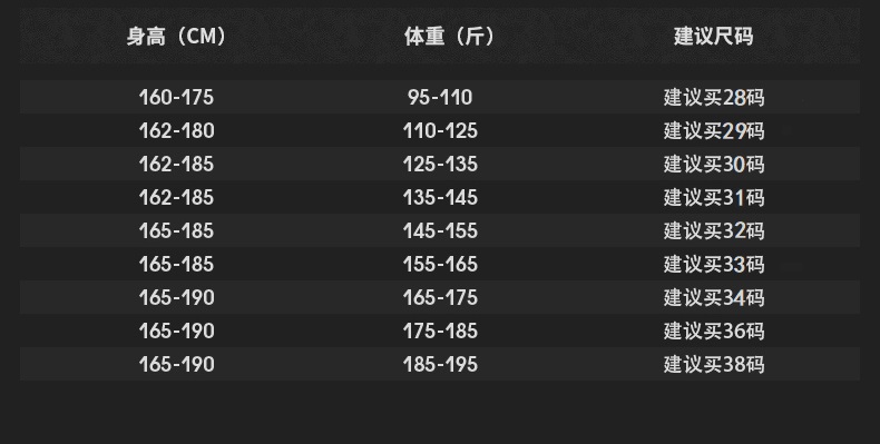 尺码:28 29 30 31 32 33 34 36 38