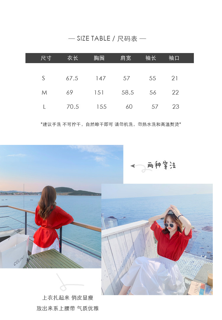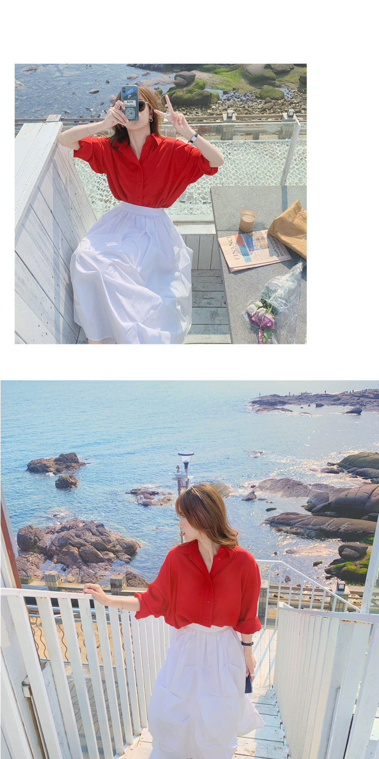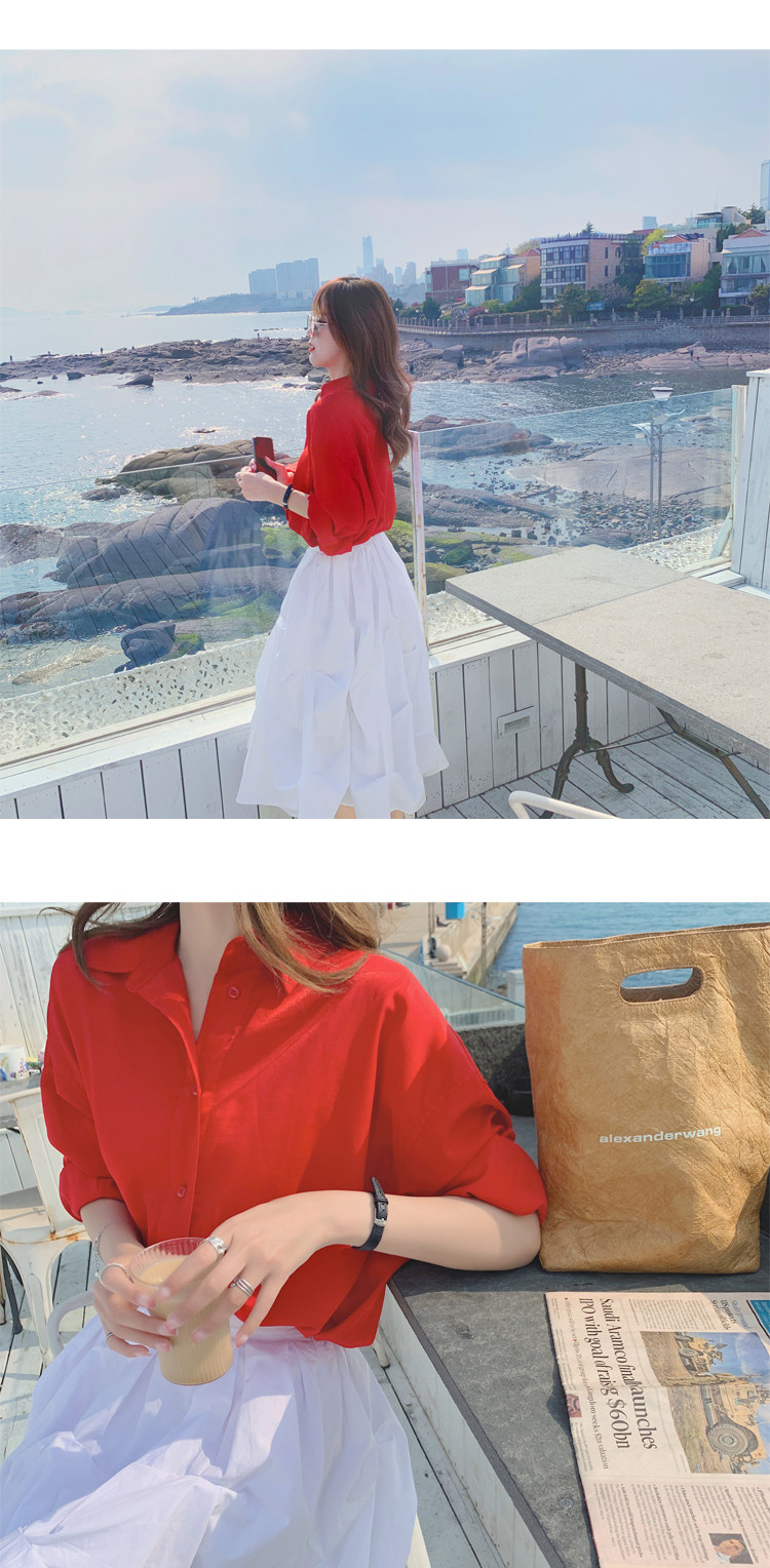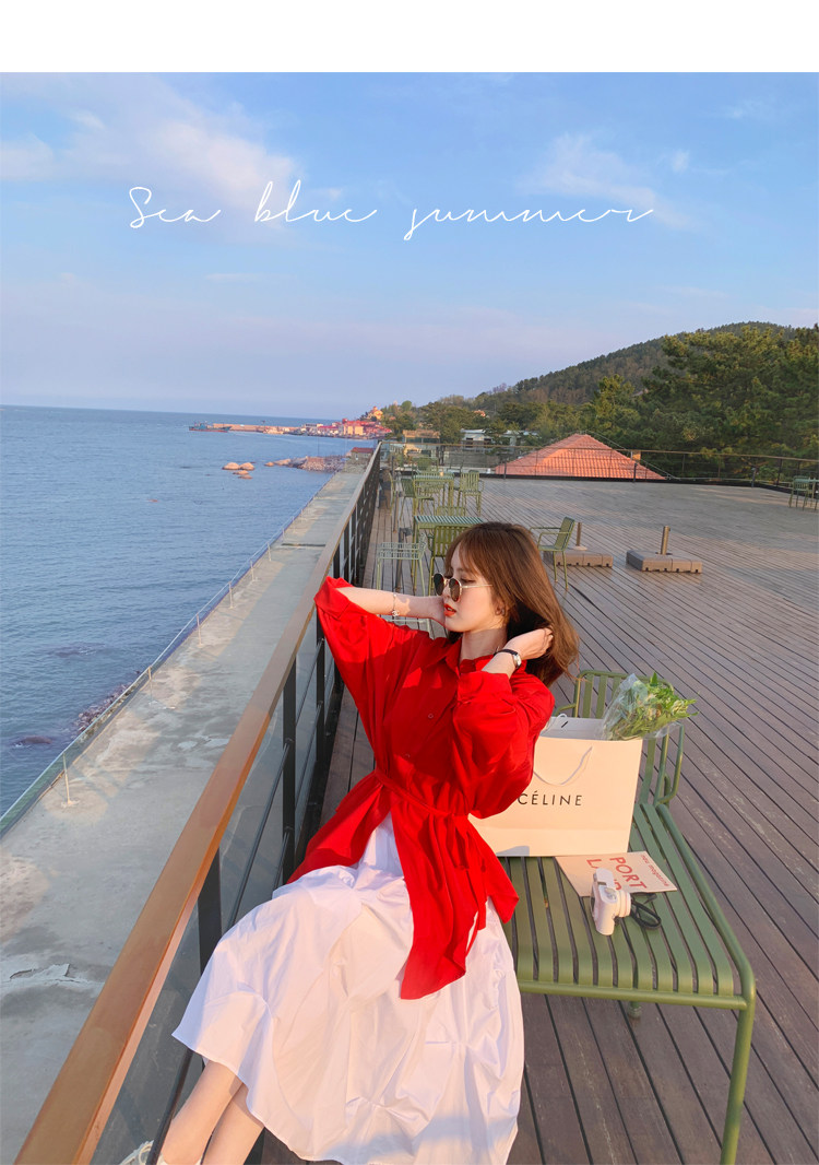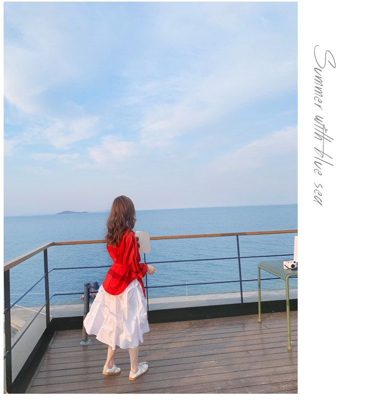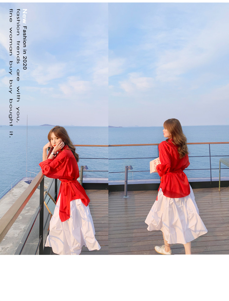 - 颜色分类: 红色衬衫 白色半身裙